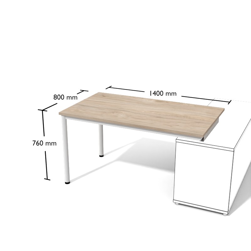 Blat o grubości 25 mm, nawisy pomiędzy nogami a blatem po 10 mm przód i tył oraz boki biurka. Nawis pomiędzy belką a blatem 32 mm przód i tył oraz boki biurka.