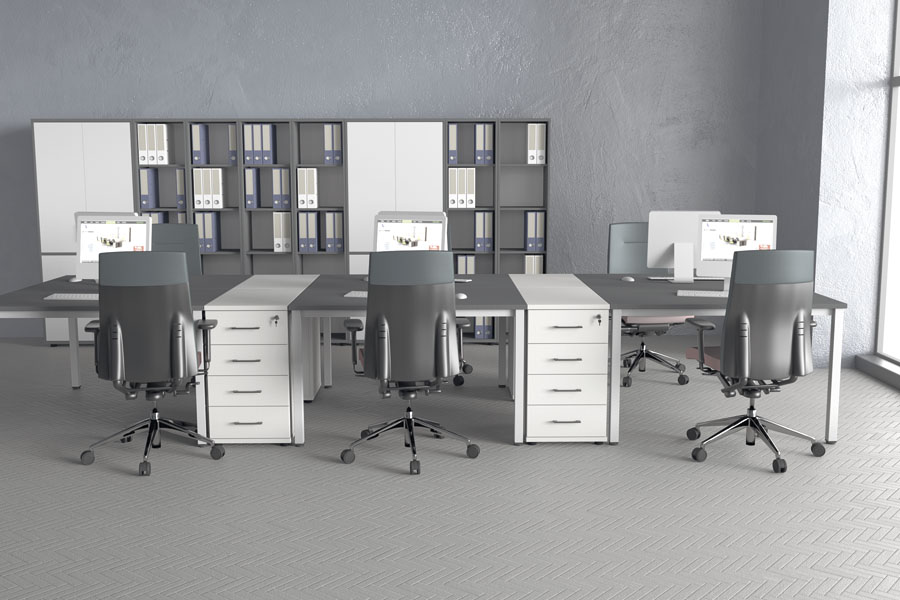 Łącząc biurko z kontenerem i dostawką w prosty sposób uzyskuje się większą powierzchnię roboczą blatu wraz z miejscem do przechowywania przedmiotów w zasięgu ręki.