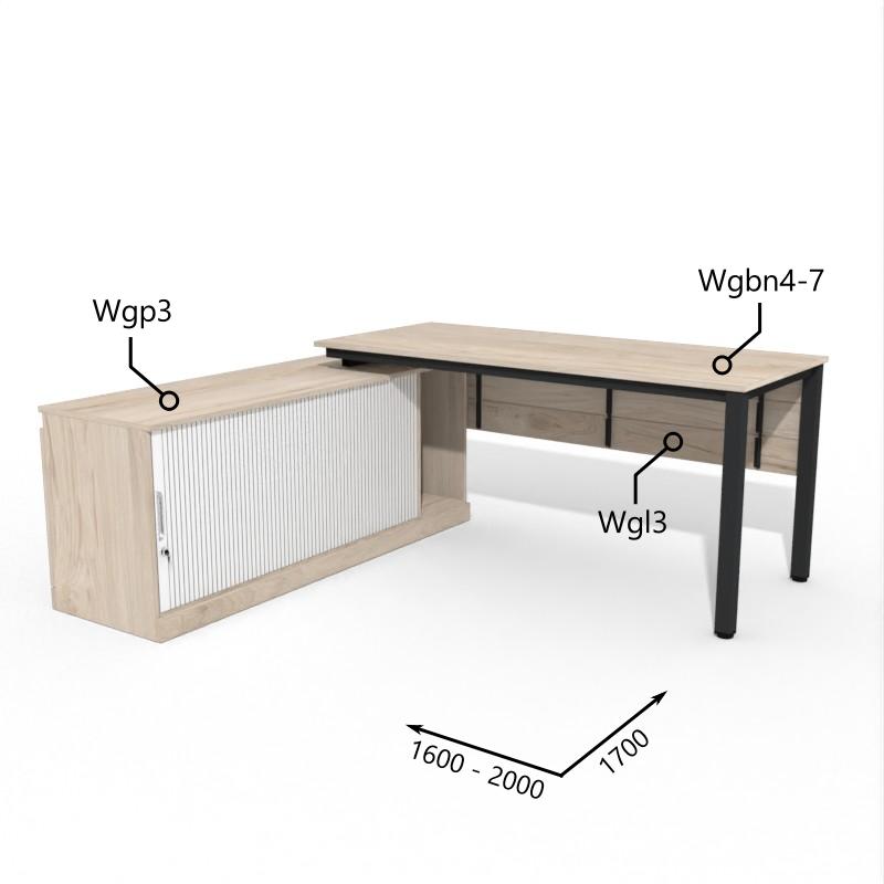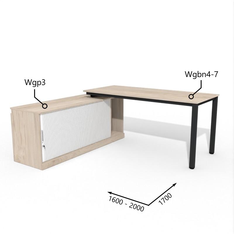 Stanowisko pracy złożone z biurka Wgb4-7 z osłoną Wga5, dostawki Wgd4 i kontenera Wgk2. Kontener pokazany z kółkami K1 dostępnymi jako