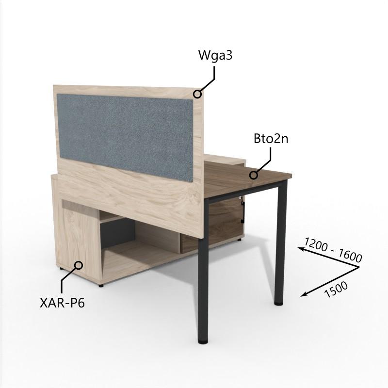 Zastosowanie biurek podwójnych, prostych Btk i Bto do tworzenia stanowisk ustawionych w jednej linii, biurka przedzielane są przegrodami z podcięciami do biurek podwójnych.