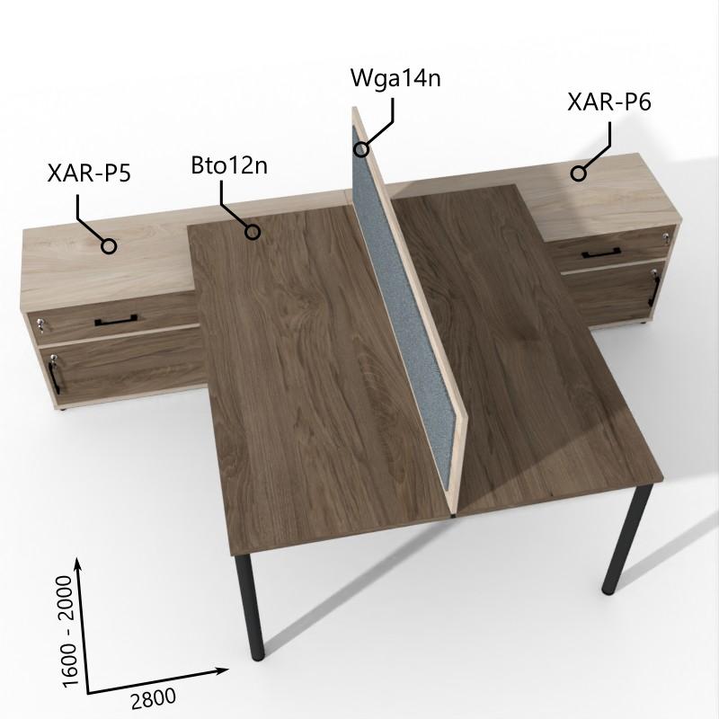 Zastosowanie biurek podwójnych, prostych Btk i Bto do tworzenia stanowisk ustawionych w jednej linii, biurka przedzielane są przegrodami z podcięciami do biurek podwójnych.